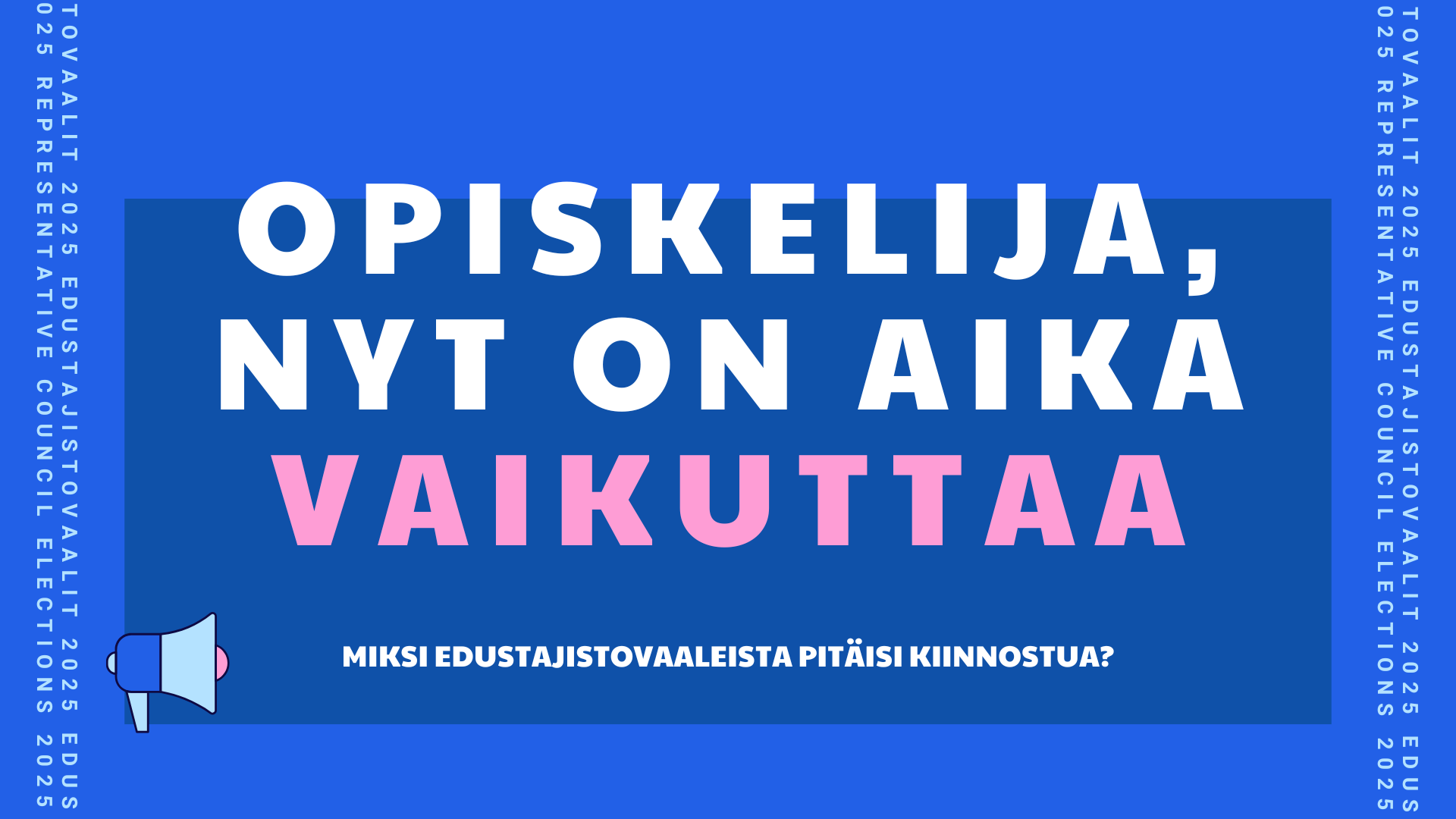 Kannustankin kaikkia teitä: hakekaa. Hakekaa edustajistoon. Hakekaa kiltanne hallitukseen, Hallopedeiksi yliopiston päättäviin elimiin, yhteisöihin jotka vaikuttavat teidän arkeenne. Vaikuttakaa asioihin, joilla on teille merkitystä ja ottakaa kaikki irti opiskeluajastanne. Jos hakeminen ei ole sinulle vaihtoehto, niin ainakin äänestä. Äänestä ehdokasta, joka jakaa kanssasi samanlaisen ajatusmaailman – se on pienin mahdollinen teko, jolla voit vaikuttaa.
